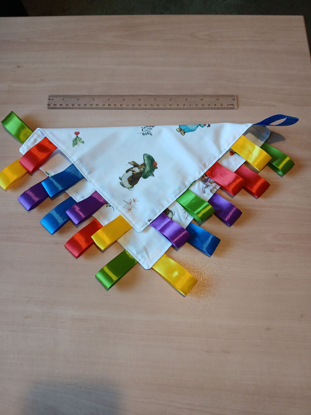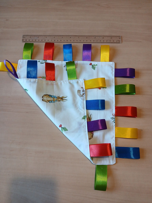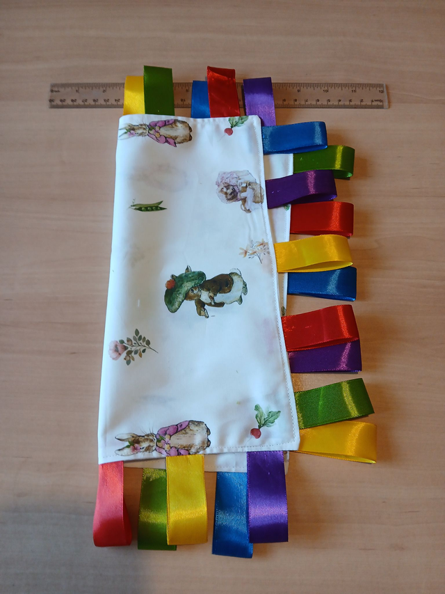 The same fabric is used on both sides with varied colours and lengths of ribbons sewn into the seams.